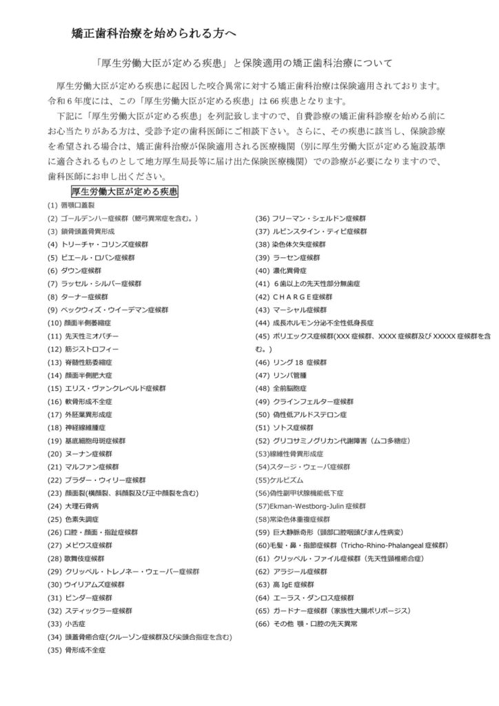 - 「別に厚生労働大臣が定める疾患」に起因した咬合異常に対する矯正歯科治療